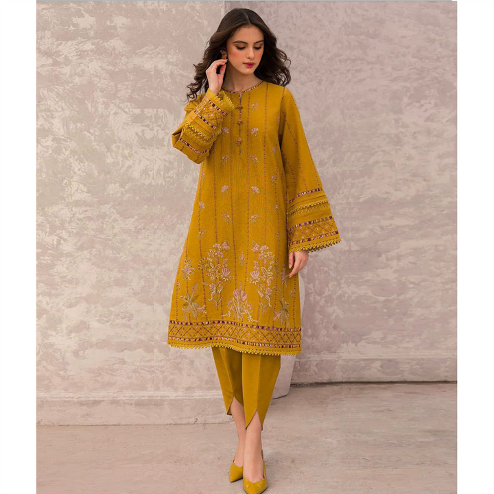 Elevate your wardrobe with this JAZMIN 3PC EMB LUXURY DESIGNER DHANAK . Designed with a graceful EMB on a soft EMB base, this shirt ,Shawl and trouser combo is a versatile pick for warm-weather days, ensuring comfort and effortless style.